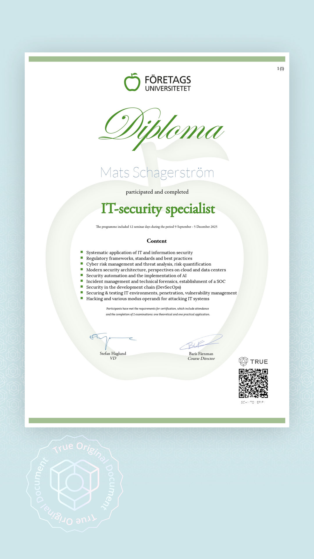 Alla TRUE -document är säkrade med blockchain-teknologi och kan verifieras som äkta. Klicka på verifieringsknappen bredvid dokumentet eller skanna QR-koden med din smartphones kamera. Ingen app krävs - dokumentets äkthet verifieras omedelbart.