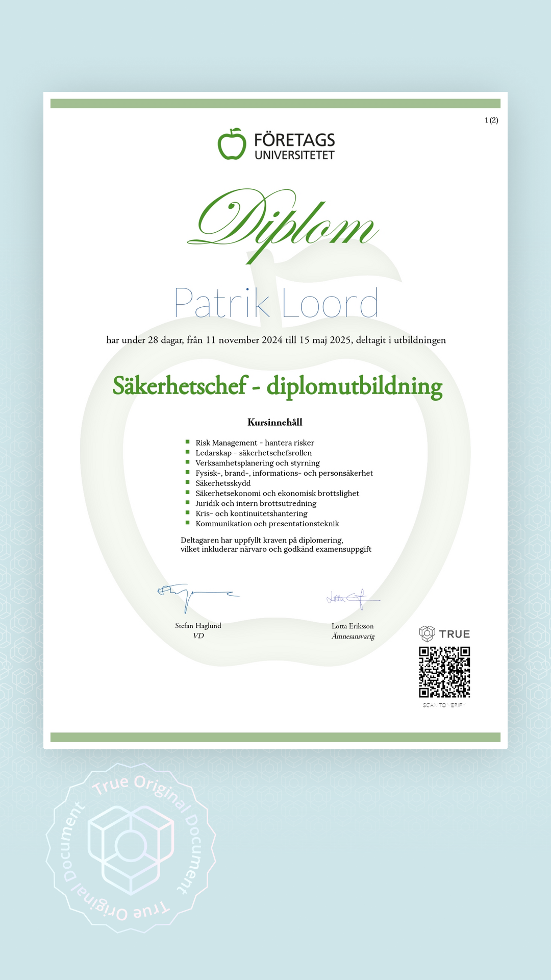Alla TRUE -document är säkrade med blockchain-teknologi och kan verifieras som äkta. Klicka på verifieringsknappen bredvid dokumentet eller skanna QR-koden med din smartphones kamera. Ingen app krävs - dokumentets äkthet verifieras omedelbart.