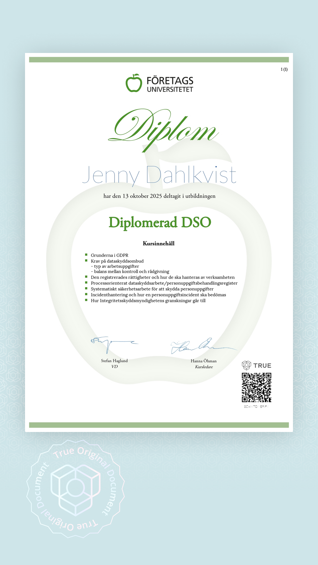 Alla TRUE -document är säkrade med blockchain-teknologi och kan verifieras som äkta. Klicka på verifieringsknappen bredvid dokumentet eller skanna QR-koden med din smartphones kamera. Ingen app krävs - dokumentets äkthet verifieras omedelbart.