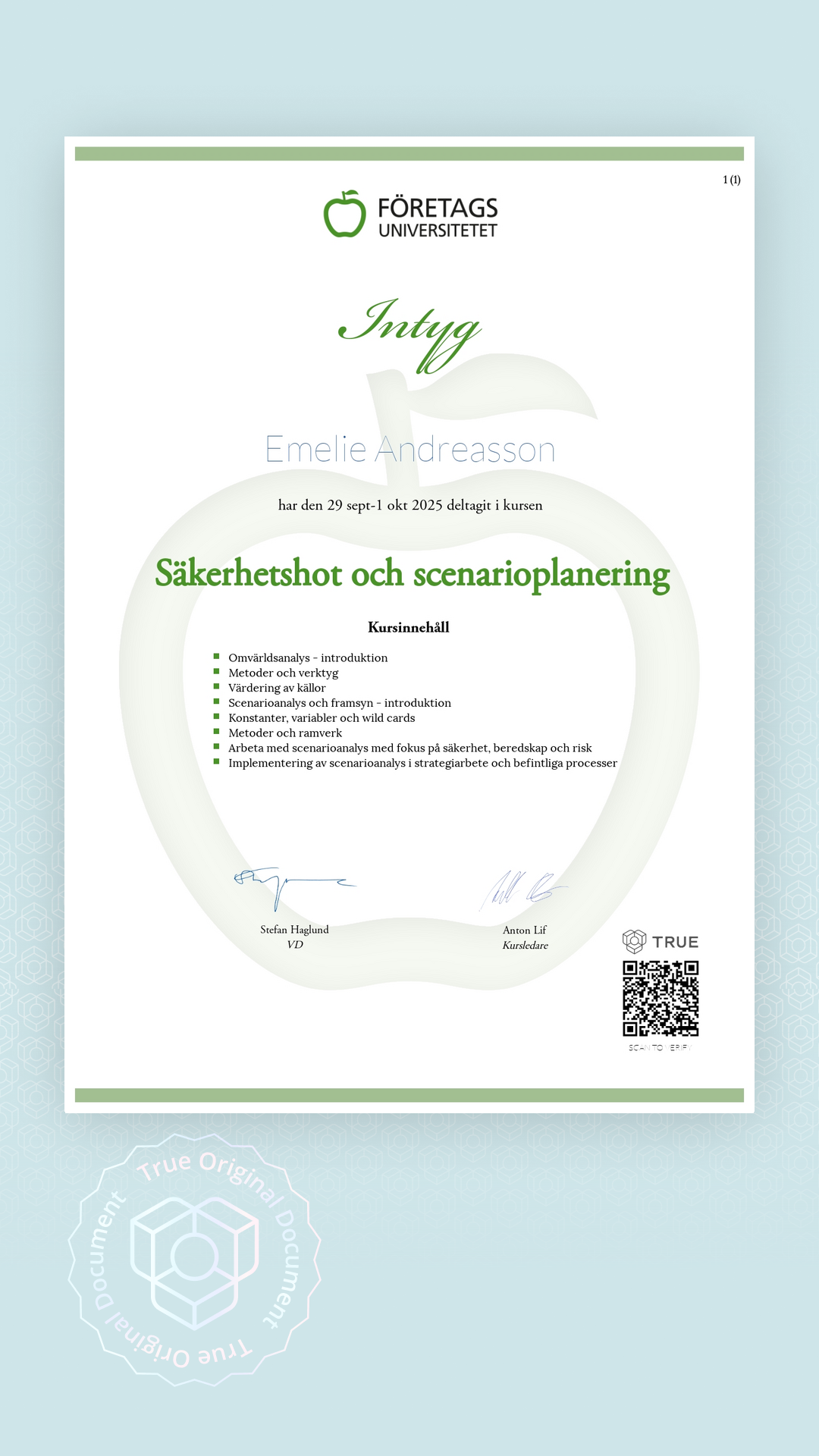 Alla TRUE -document är säkrade med blockchain-teknologi och kan verifieras som äkta. Klicka på verifieringsknappen bredvid dokumentet eller skanna QR-koden med din smartphones kamera. Ingen app krävs - dokumentets äkthet verifieras omedelbart.