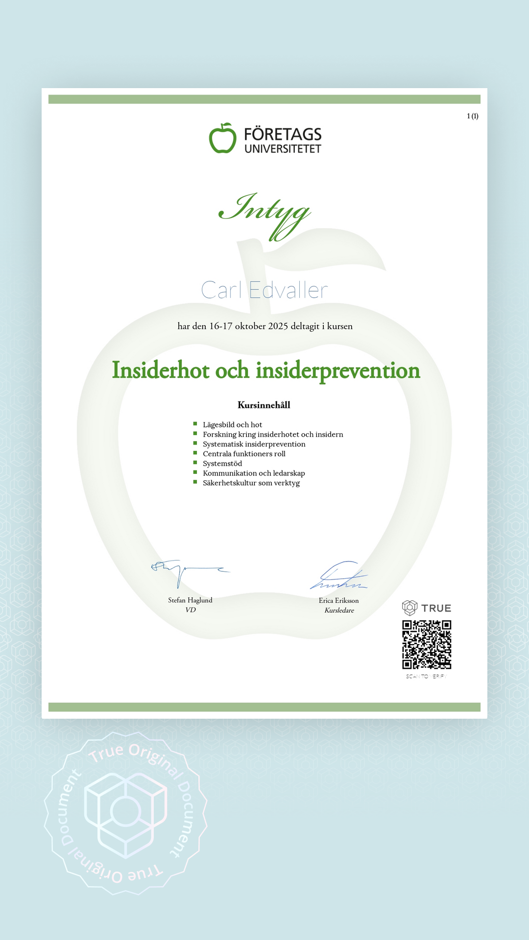 Alla TRUE -document är säkrade med blockchain-teknologi och kan verifieras som äkta. Klicka på verifieringsknappen bredvid dokumentet eller skanna QR-koden med din smartphones kamera. Ingen app krävs - dokumentets äkthet verifieras omedelbart.
